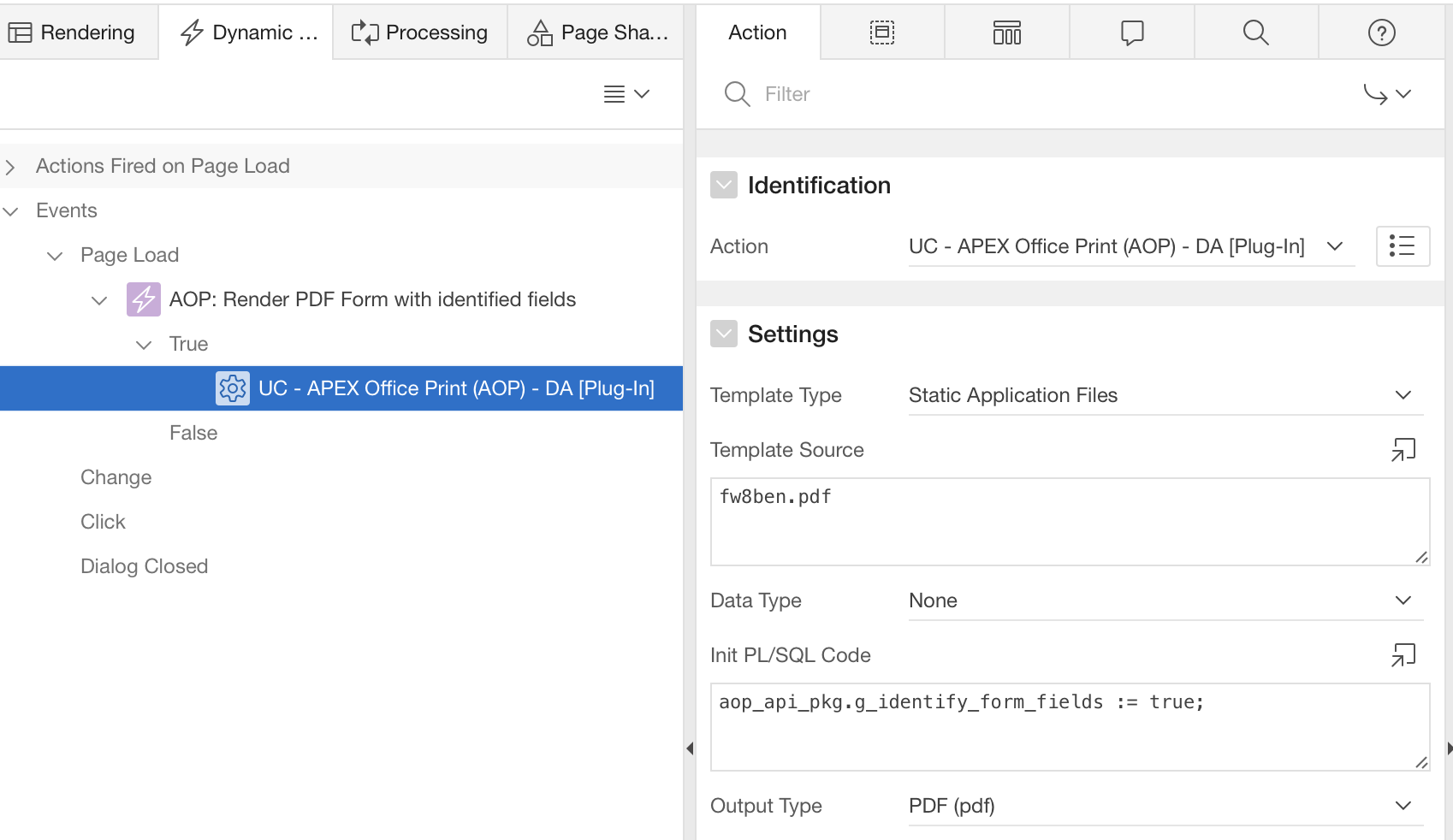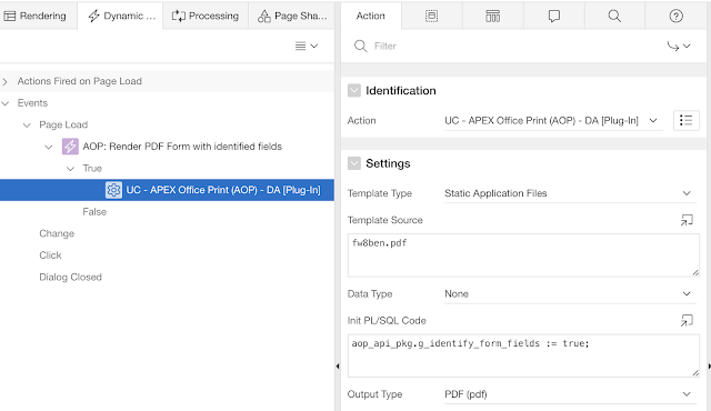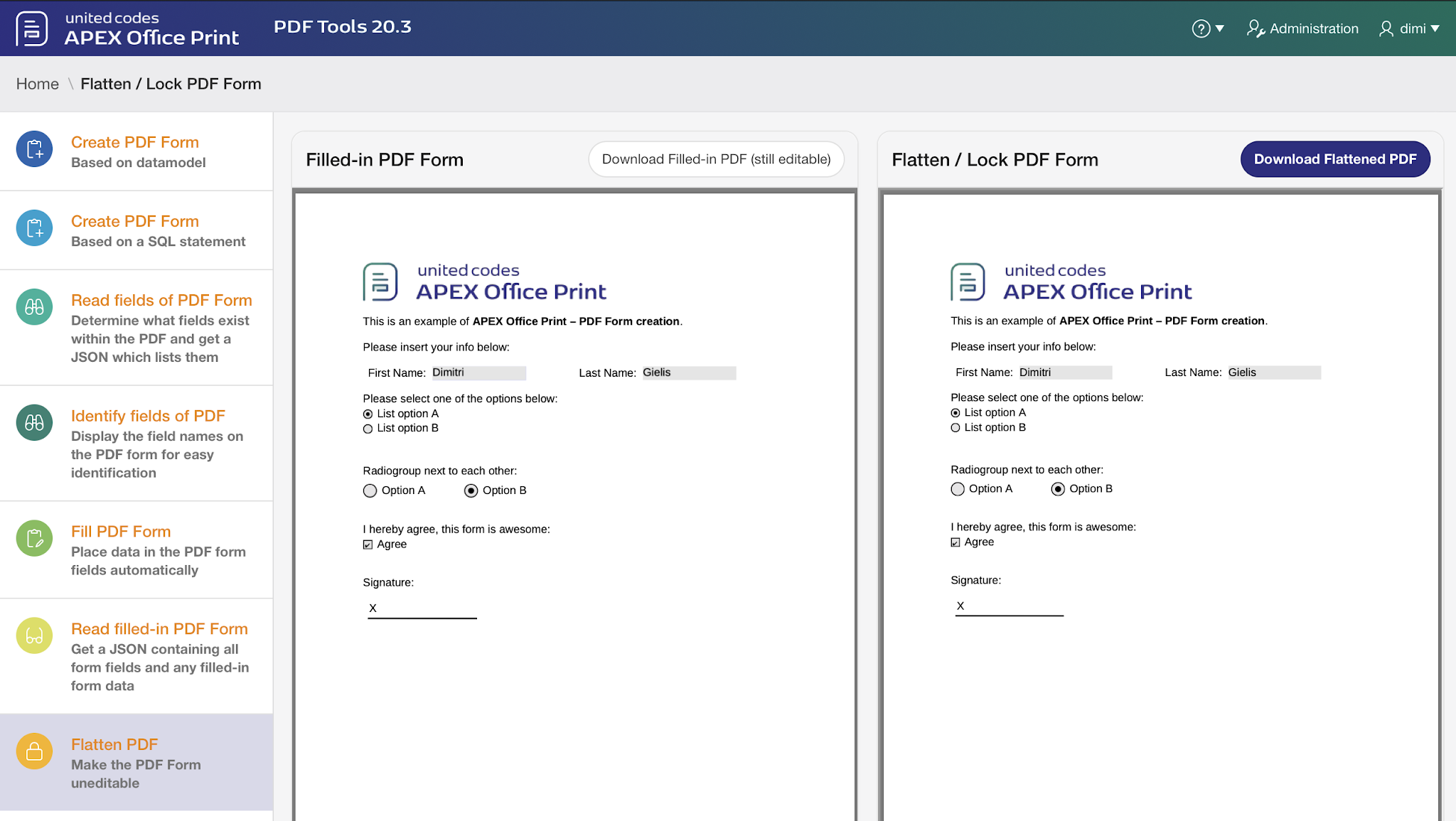 Finally, in case you filled in the PDF Form and now want to make sure other people can't change the fields anymore, you would flatten the PDF. Again, use the AOP PL/SQL API or APEX Plug-in, set the global variable g_output_lock_form to true and you are done!