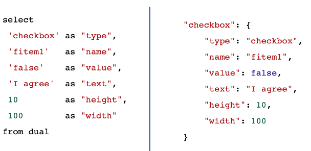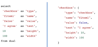 You can specify the item details in AOP by defining the JSON, a SQL, or PL/SQL statement for example. Here's how the definition looks in a SQL Statement and in JSON: