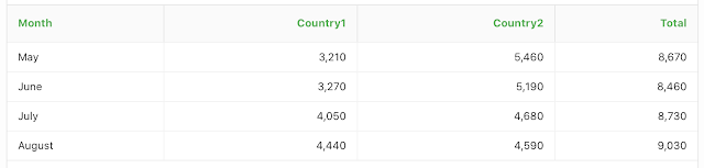 The table below shows the number of positive cases in the last 4 months for two different countries and a total.