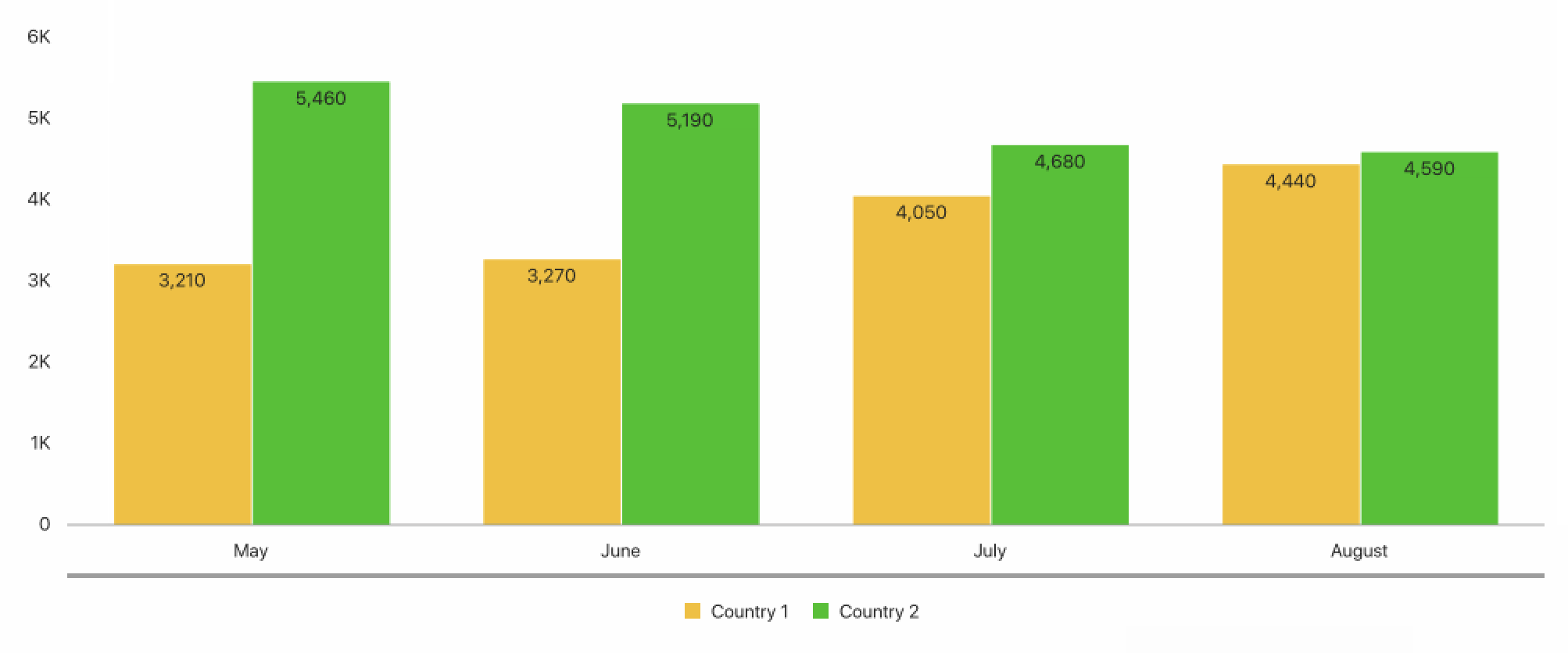 The clustered column chart directly compares the two columns. This is perfect when I want to focus on the difference between both countries: the orange column vs the green column. I changed the colors of the charts as they better represent the country and the difference is shown more clearly.