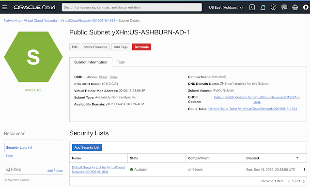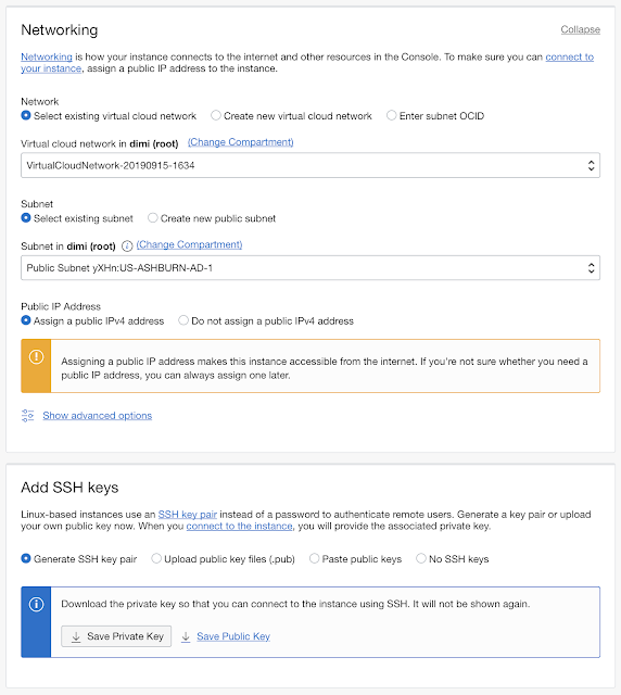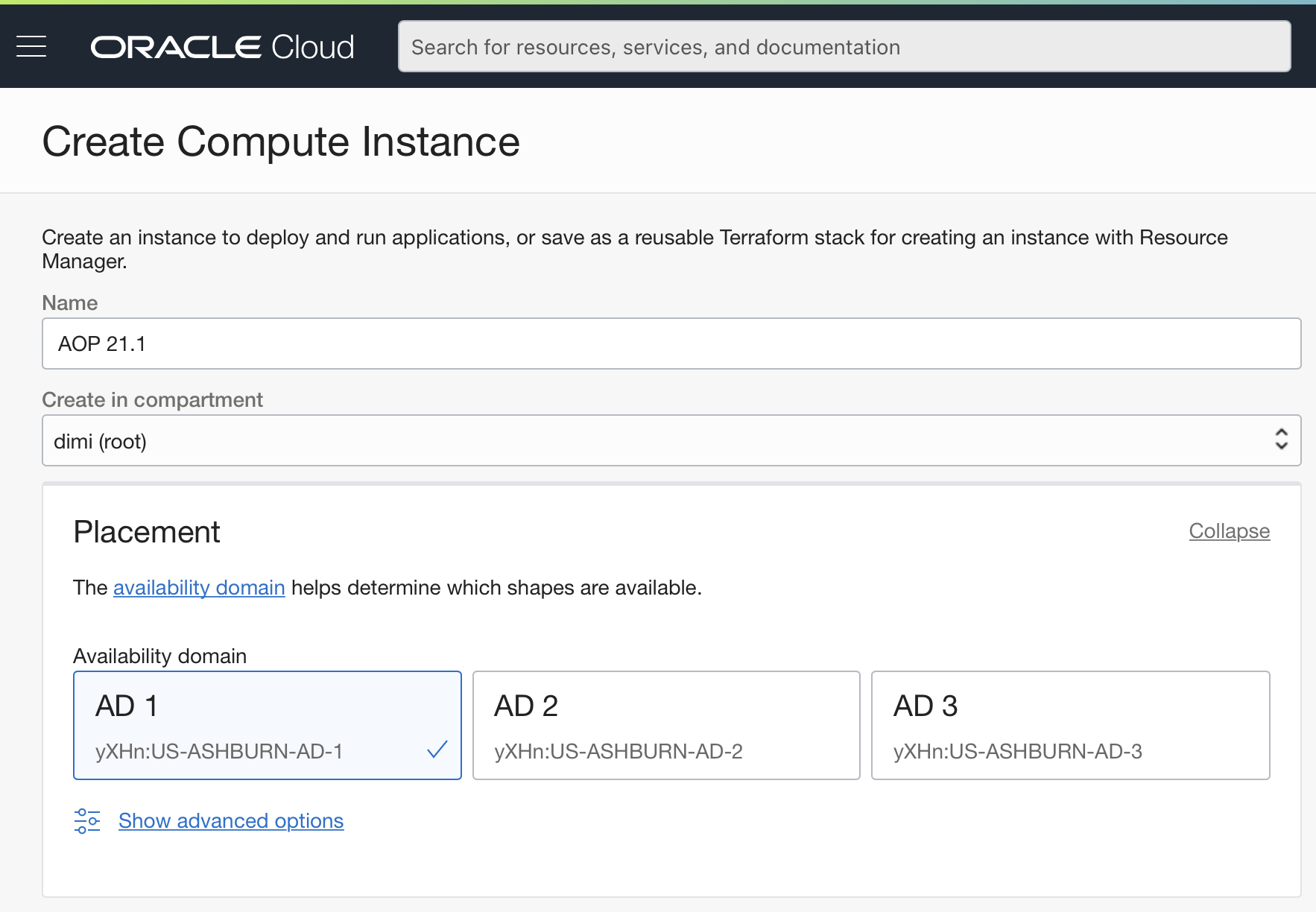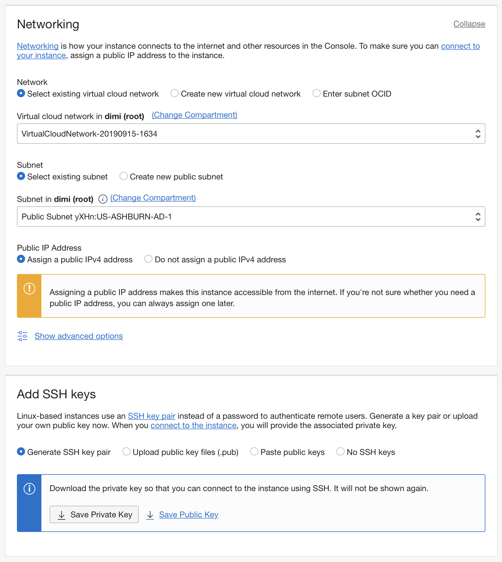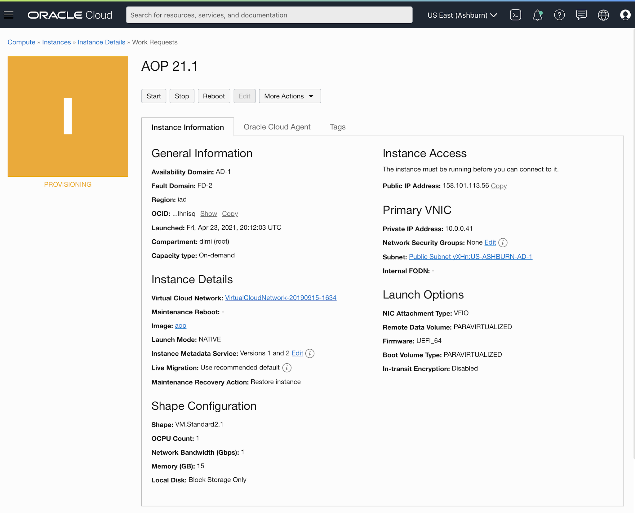 Select the network and assign a public IP address. Note that the public IP is not really necessary, but it just makes the activation of AOP easier as you can connect directly to the Compute instance: