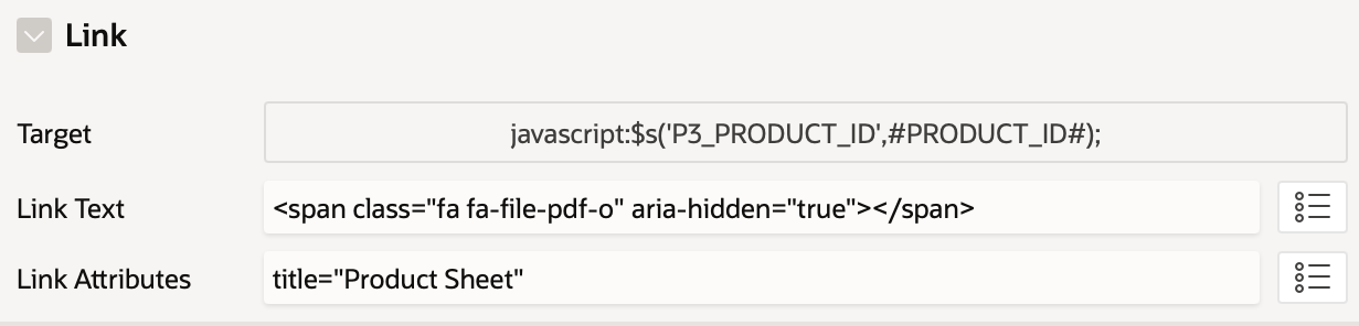 PRODUCT_SHEET column in the Interactive Report and give it a type Link. Next, in the Link section, use the following settings: