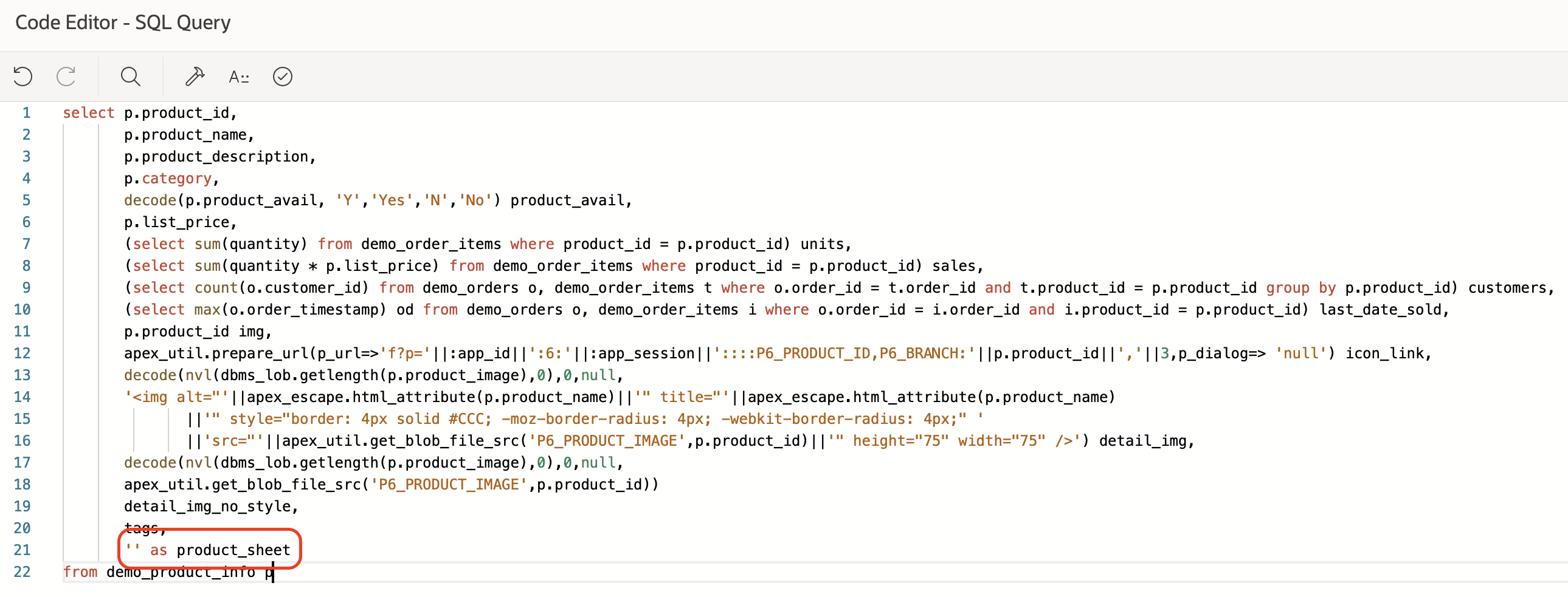 In this blog post we're going to generate a product sheet using some pretty cool APEX Office Print (AOP) features like image tags and conditional formatting. The Products page (page 3) in the Sample Database Application is our starting point.