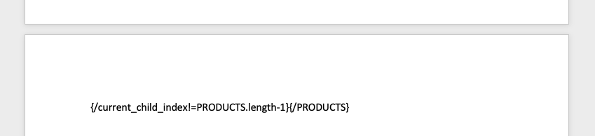 We start by opening the Products cursor (or loop) using the {#PRODUCTS} tag to be able to list all products. Each product should be on a separate page, that’s why there is a special tag at the bottom: {#current_child_index!=PRODUCTS.length-1}. Insert a page break after this tag, the last line of our template will be on a second page: