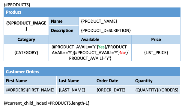 At the bottom of the template, the {#ORDERS}…{/ORDERS} tag will loop over the customer's orders that contain the selected product.