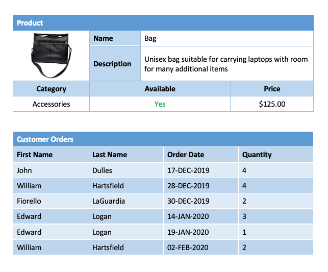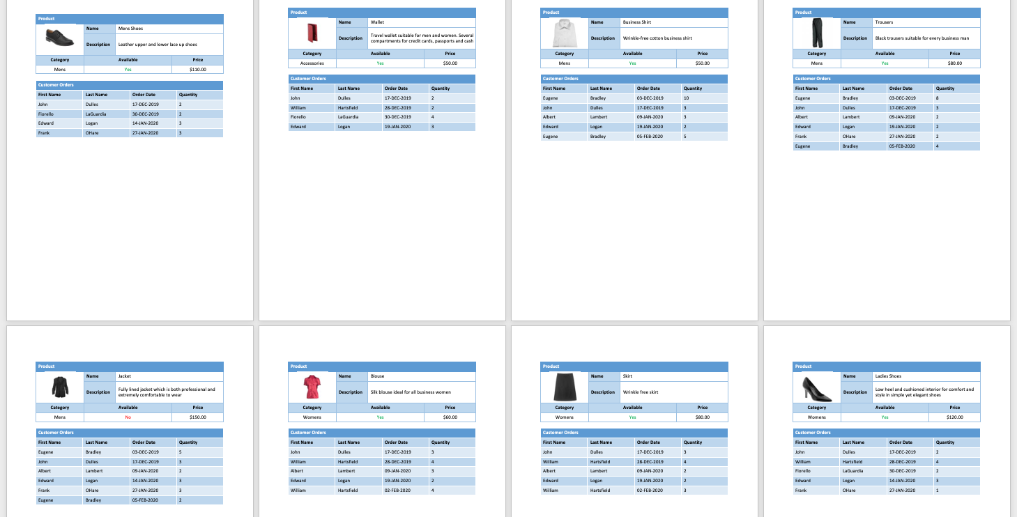 The product sheet contains some basic product information and an overview of customer orders. The template contains two tables, one for each section. You can use any of the styling features available to you natively in Word in order to get the look and feel of your template exactly how you want it.