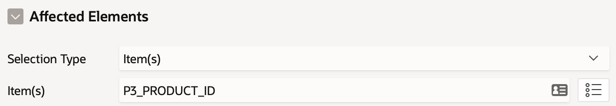 In the Affected Elements section of the AOP dynamic action, clear the Selection Type as we don't need the Page Item P3_PRODUCT_ID anymore.