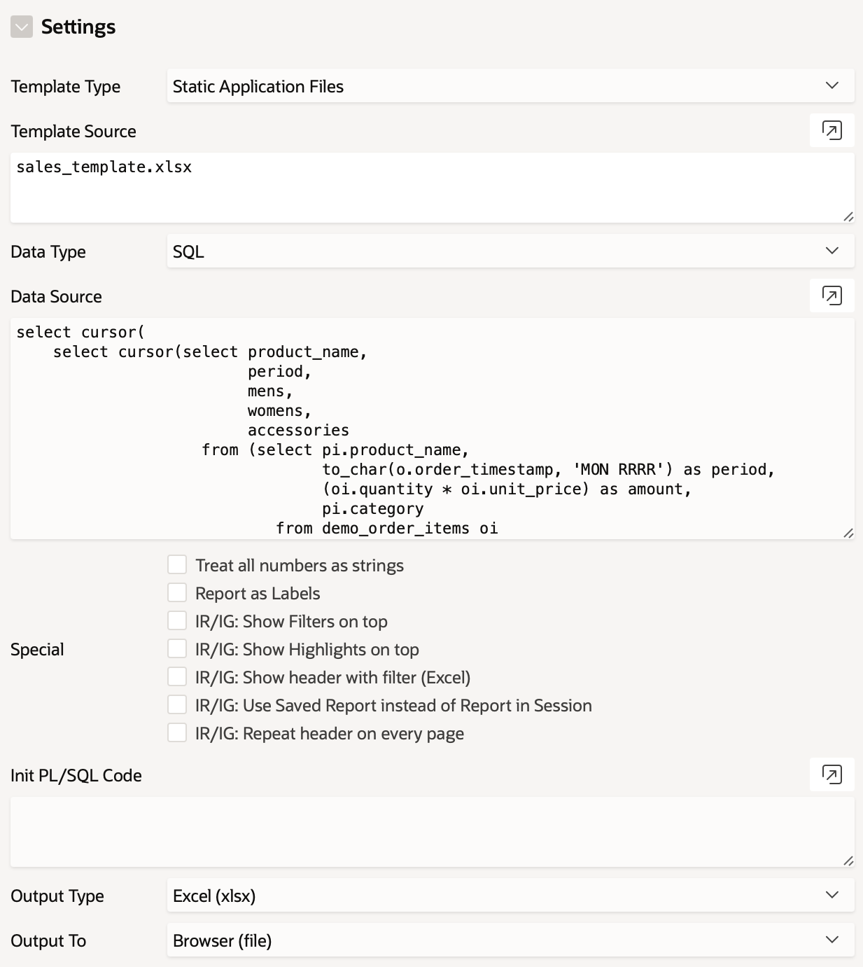 select cursor ( select cursor ( select product_name, period, mens, womens, accessories from (select pi.product_name, to_char(o.order_timestamp, 'MON RRRR') as period, (oi.quantity * oi.unit_price) as amount, pi.category from demo_order_items oi join demo_orders o on o.order_id = oi.order_id join demo_product_info pi on pi.product_id = oi.product_id order by o.order_timestamp) pivot (sum(amount) for (category) in ('Mens' as mens, 'Womens' as womens, 'Accessories' as accessories))) as sales from dual) as "data" from dual