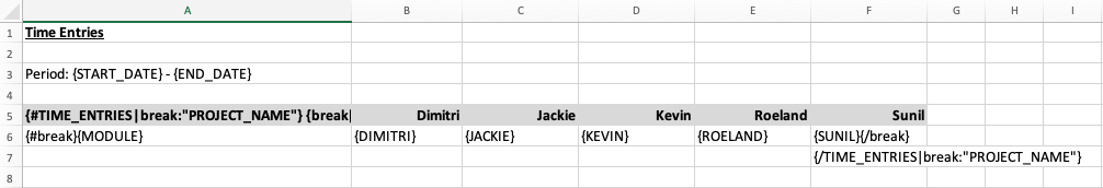 This was my ‘customer_report_template’ in Excel. Because I wanted to have a white line after each project, I put the {/TIME_ENTRIES|break:"PROJECT_NAME"} closing tag on a new row.