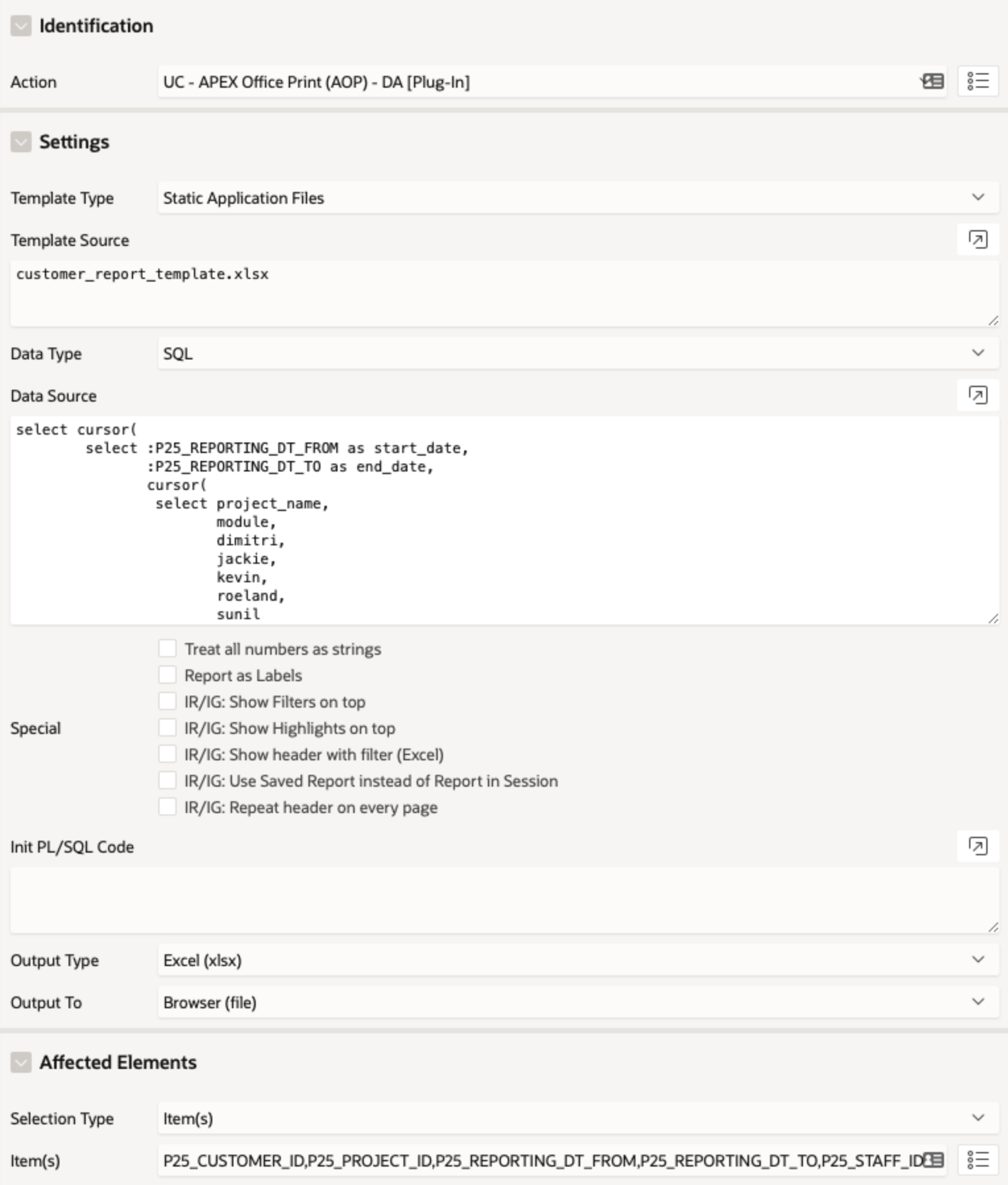 The Data Source is a SQL query which returns the data as shown in the highlighted report above. The page items which are used for filtering are included in the Affected Elements section. I won’t go into all the details of the query, but there are a few things I’d like to point out:
